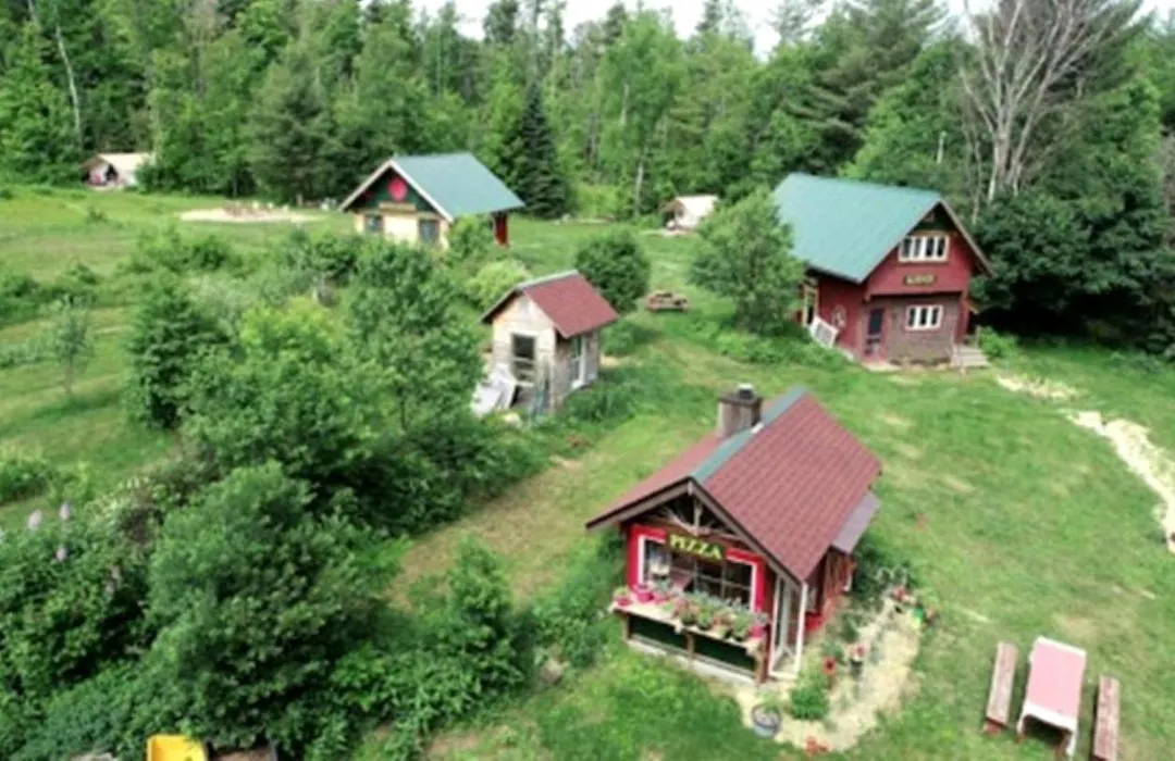 Cozy Tented Cabin Rental Near Hudson River In Upstate New York comprend une cuisine complète dotée d'un réfrigérateur et de la vaisselle.